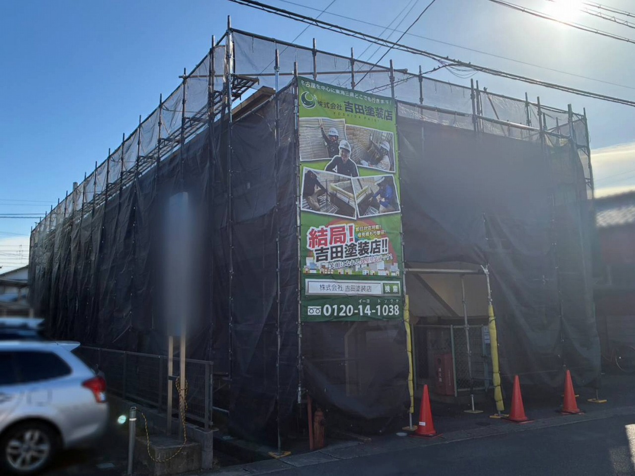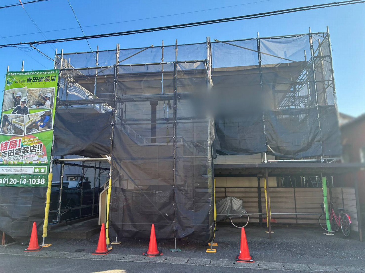 足場組立が完了し工事が始まりました。